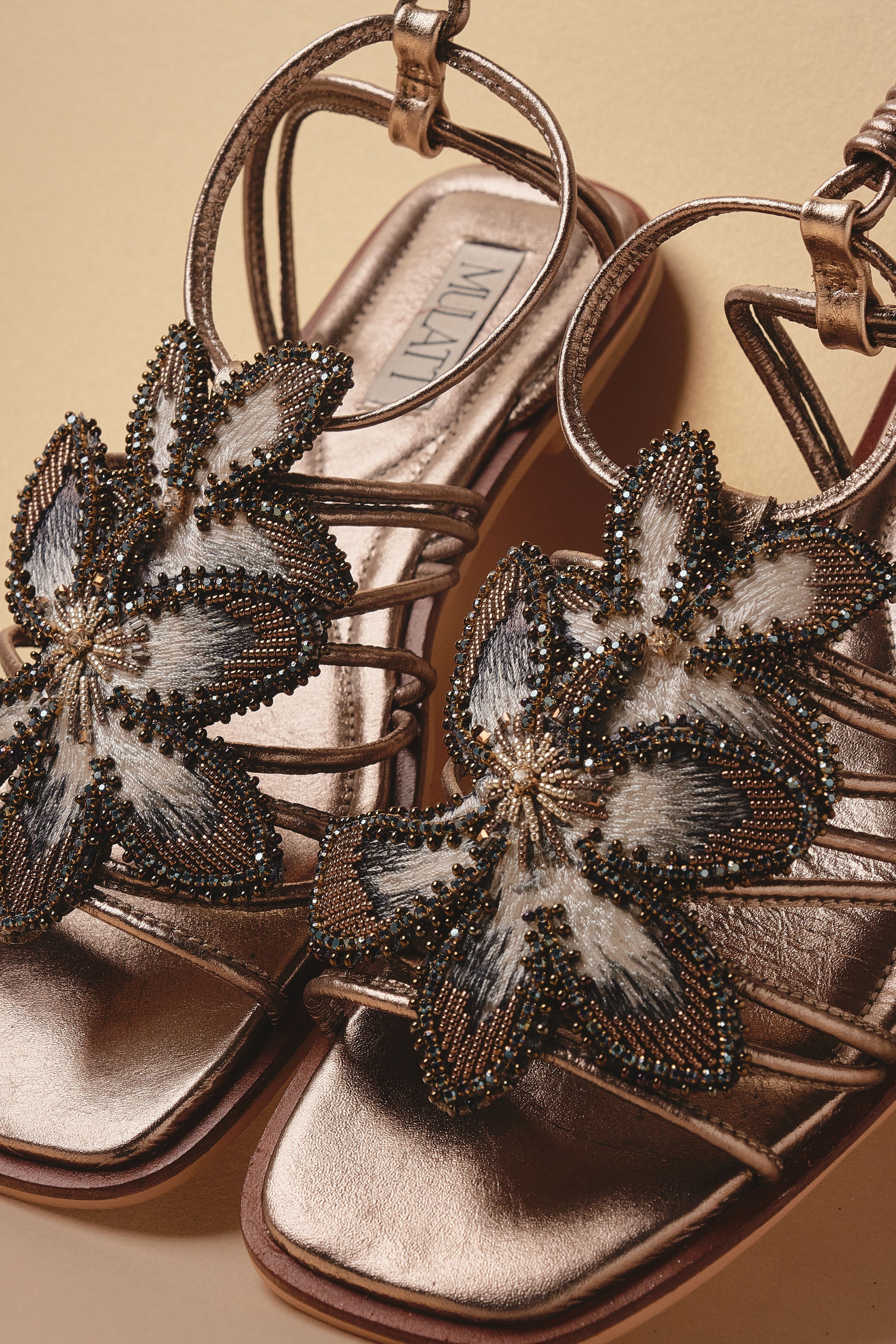 • Zapatos hecho 100% a mano por artesanos Colombianos. Suela caucho,  parte superior Textil recamada en pedrería, Interior cuero.